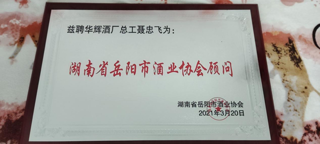 2021年被湖南岳阳酒业协会聘为酱香白酒专家顾问。